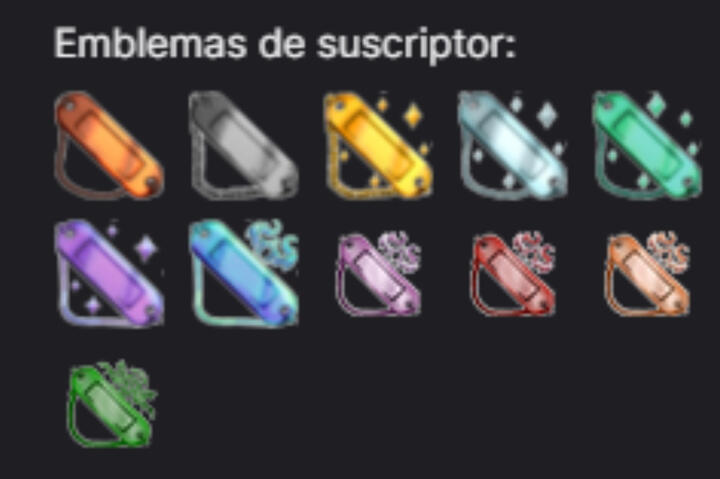 Actualmente al ser suscriptor de twitch puedes tener los siguientes EMBLEMAS los cuales van cambiando según el tiempo que lleves suscrito al canal.