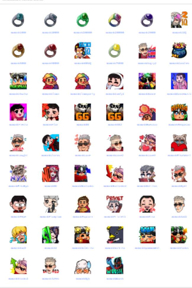 De igual forma, actualmente en el canal de Momonkunn se puede usar 43 emotes (algunos animados) los cuales están relacionados con el contenido del canal.